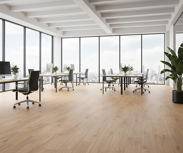 Modern office build-out specifying commercial-grade SPC for open workspace areas. Stone-look designs in reception and conference rooms. Selected for acoustic properties and maintenance simplicity.